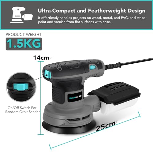 Be the first to review “Bluemars 320W Random Orbit Sander,6 Variable Speeds (8000-13000RPM),16Pcs Sandpapers,125mm Sanding Pad, Mini Electric Sander”