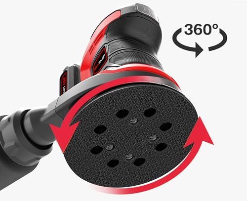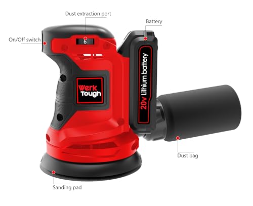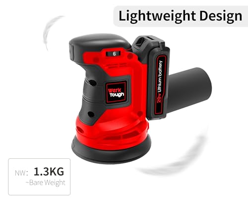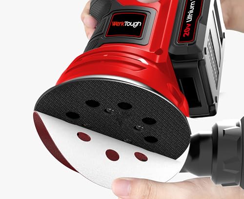 Wertough SA002 20V Cordless Random Orbital Sander – 6-Step Speed With 2.0A Battery and Fast Charger, 125mm Wheel, 6 Sanding Papers, Dust Bag – Red
