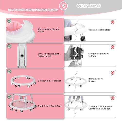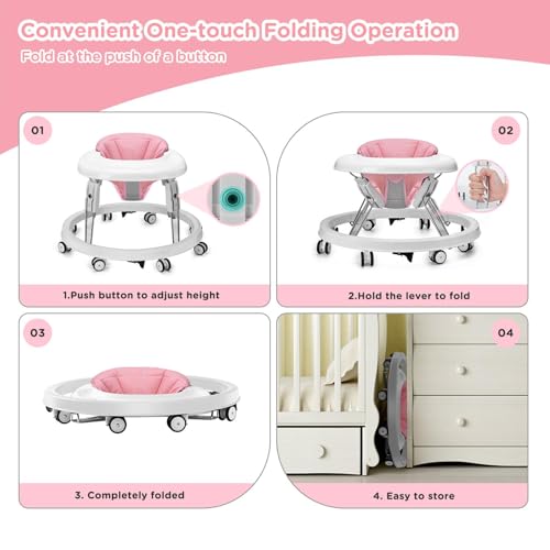 Specification: Baby Walker, Foldable Multi-Function Anti-Rollover Walker with Brake Design, 7 Level Height Adjustable, Baby Walkers for Boys 6 Months Suitable for All Terrains (Pink)