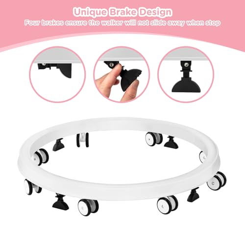 Parking Brake Design: Baby walkers for boys 6 months+ equipped with four parking brakes, you can put down the brakes when needed, the baby walkers can be turned into a fixed activity center. When there is no time to look after the baby, the brakes will make the baby safer