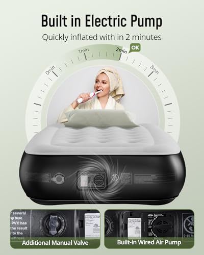 【One-Touch Quick Self-Inflating in 2 Mins】: Equivalent to brushing time!Say goodbye to time-consuming inflating processes with the built-in pump that inflates the single airbed within just 2 mins. It’s easy to operate – simply plug it in, flick the switch, and the inflatable mattress will start inflating immediately.