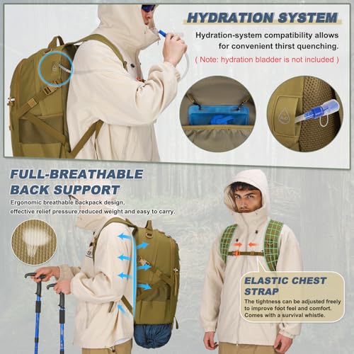 🏔️43L Tactical Organizer for Adventures:Conquer rugged trails with military-grade 43L backpack engineered for multi-day expeditions.And 5 compartments swallows your essential gear. Strategic mesh side pockets secure 1L water bottles within arm’s reach, while the front admin compartment keeps compasses/map readers accessible via detachable key leash. Bonus: Expandable compression straps lock down jackets when weather shifts.