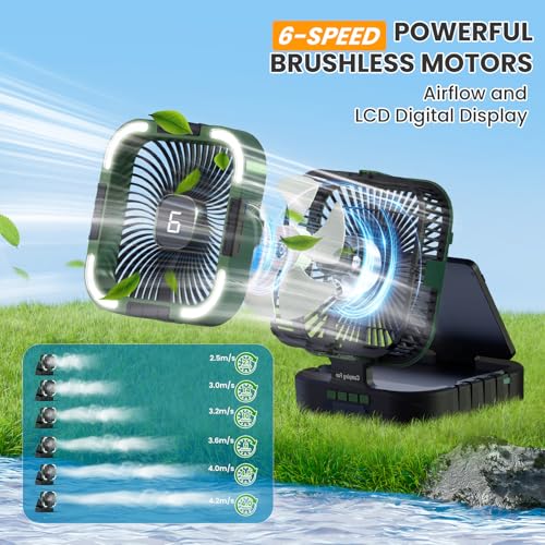 TABLE FAN 6 WIND SPEEDS: Choose from 6 wind speeds, from a gentle breeze (under 35dB) to a powerful airflow. The table fan with digital display shows battery life, speed, and timer—great for tents, RVs, and travel.T his portable fan provides ultra-long run time from 4 to 23 hours on a single charge