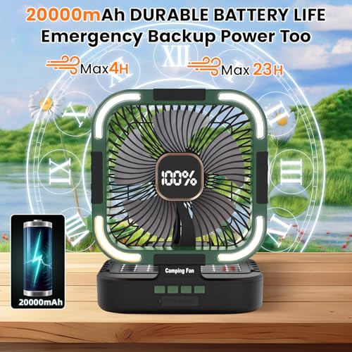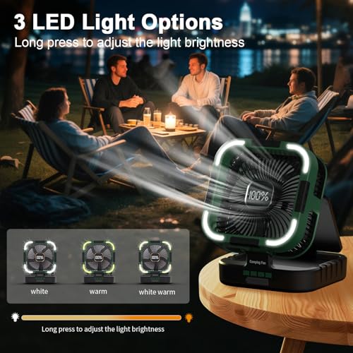 RECHARGEABLE FAN WITH LIGHT: This battery operated fan doubles as a 20,000mAh power bank to charge phones and devices. Battery fan features 3 lighting modes (White/Warm/Combo) with adjustable brightness—perfect for nighttime camping or emergencies.