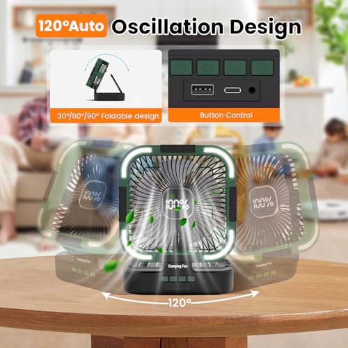 WIDE-AREA COOLING DESK FAN: The rechargeable fan provides 120° auto-oscillation, distributing airflow evenly across your tent or room. Set the desk fan with 1/2/4/6H timer for hassle-free cooling while sleeping—no need to wake up to turn it off!