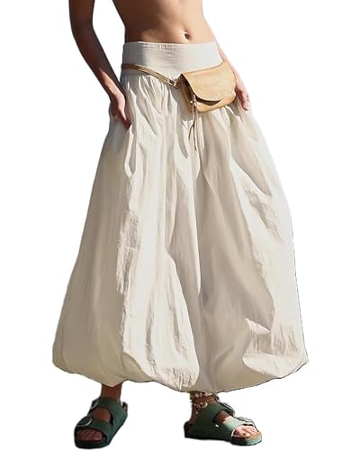 Acrawnni Women Y2k Bubble Maxi Skirt Low Elastic Waist Ruffle Pleated A-line Long Skirts Summer Beach Loose Fit Cute Puffball Balloon Skirt