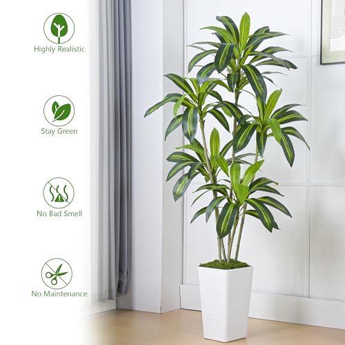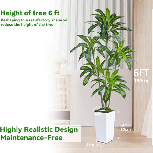 Brighten Up Your Decor: This 6ft/180cm tall Artificial Dracaena Tree has 5 light brown simulated tree trunks connected with up to 80 dense green and glossy sword-shaped leaves. Inclus a white tall planter(14.9″H x 8.7″W) and artificial moss. The black interior planter is made of sturdy clay mix, adding simulated moss to its surface, superior to traditional wood chaff, does not shed dust, and the base is weighted for extra stability