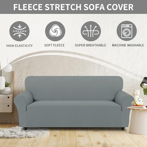 Easy-Going Stretch Fleece Sofa Cover 4 Seater, Non Slip Sofa Slipcovers for Kids Pets Dogs, 1 Piece Soft Couch Covers Oversized 3 Seater, Washable Couch Covers Furniture Protector, Light Grey