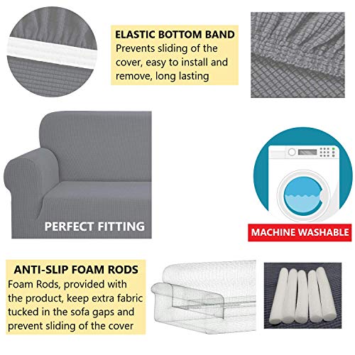 PERFECT FIT: Due to 4 ways stretch knit, our magic sofa cover follows the contours of the sofa and gives custom fitted appearance and is suitable for a wide variety of sofas such as Leather sofa, T-cushion, Box cushion, Lawson and Chesterfield sofa etc. Before purchasing, please MEASURE THE SIZE of your sofa as shown in MEASURING GUIDE in images. Our 3 seater sofa cover fits the sofa 72-92 inch (185-235 cm) in length including arms. Foam rods and elastic bottom prevent sliding of the cover.