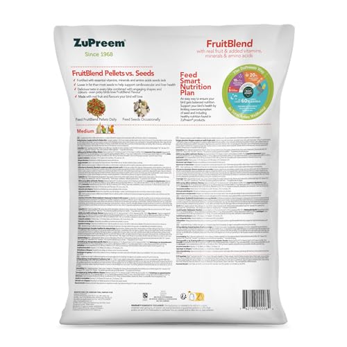 Zupreem FRUITBLEND fun and colourful pellets with complete nutrition in every bite; made with real fruit to support a long, healthy and active life, Precisely formulated recipes fortified with added vitamins, minerals and amino acids for all the essential nutrition your bird needs every day