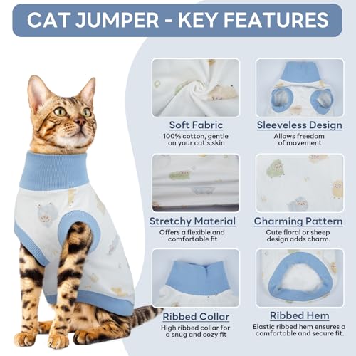 Hjyokuso Cat Jumper, Soft Cotton Sleeveless Cat Clothes, Breathable High Neck Outfit for for Daily Wear, Shedding Control, Vet Visit & Spring/Autumn Warmth (Blue Print XS)