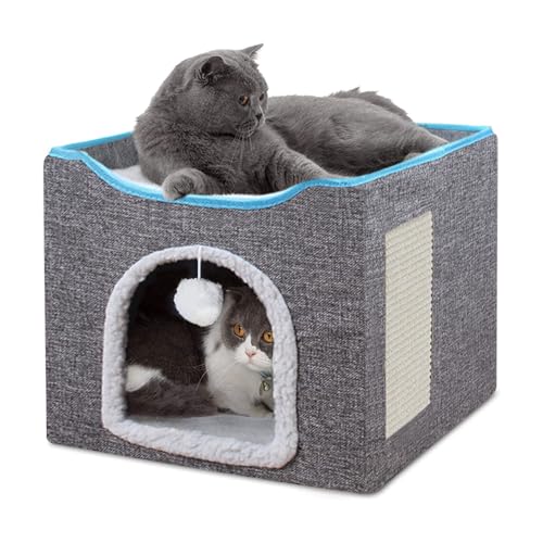Ezigoo Cat Bed Foldable Cat House Cave with Clawsable Scratching Board and Fluffy Ball Indoor for Multi Small Pet 41 * 41 * 34cm Grey