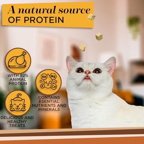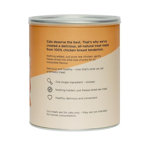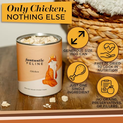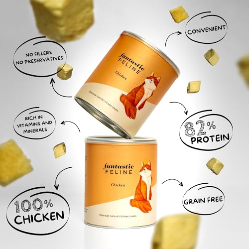 Pure chicken; If you’re in search of healthy daily cat treats that taste amazing and are good for your furry friend, these freeze dried chicken cat treats from Fantastic Feline are the answer; Featuring nothing but pure chicken, our cat snacks are the smarter choice for people who care about their cats health