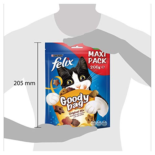 Our specially formulated FELIX GOODY BAG Original Mix flavoured with Chicken, Liver & Turkey cat treats contain proteins, vitamins and omega 6 fatty acids to help keep your cat supported.