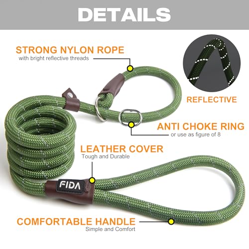 Fida Slip Rope Dog Lead | 1.8m, One-Size-Fits-All, Slip-On Rope Leash. Easy to Slip On, No Collar or Harness Needed. Durable & Weather Resistant Climbers Rope with Reflective Stitching (Green)
