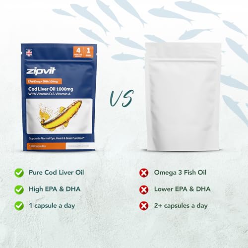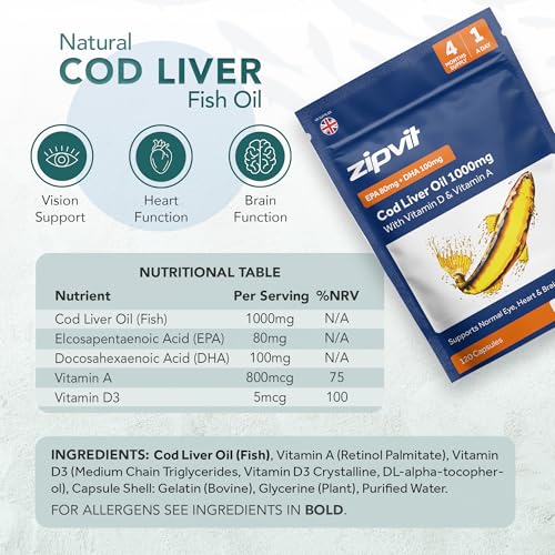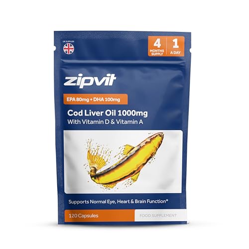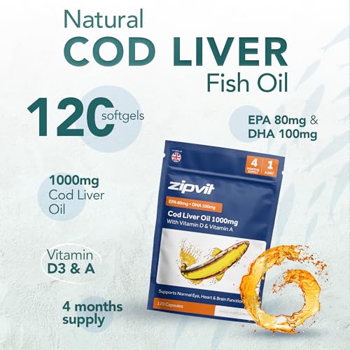 Zipvit Cod Liver Oil 1000mg, 120 Softgel Capsules, Rich in Omega-3, EPA 80mg & DHA 100mg. with Vitamins D3 & A to Support Heart, Brain, Eye Health & Immune System – 4 Month Supply